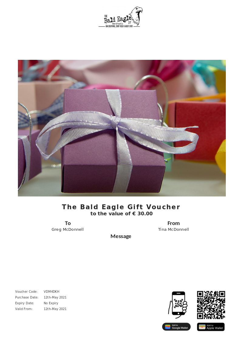 The Bald Eagle allows you to purchase instantly printable gift vouchers, special offers and tickets using the Voucher Connect platform.